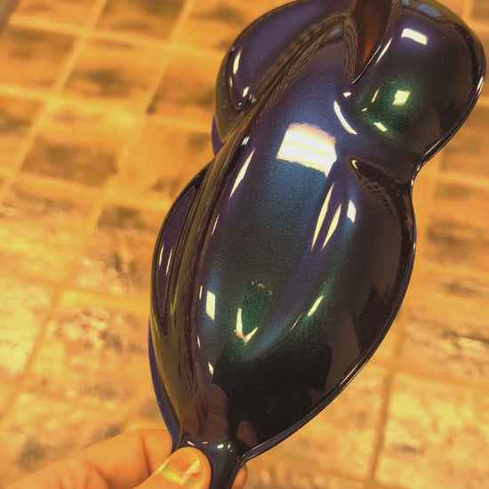 This color shows hues of blues, green, teals, purples, and red. This color is in the same family as the OEM 2000's Ford Mystic Chrome but with MORE colorshift and candy effects.All of our Alpha Custom Color Basecoats are bound in a specifically formulated binder that has pigment control (to avoid striping or mottling), great UV Resistance, crystal clear, and great pearl suspension.