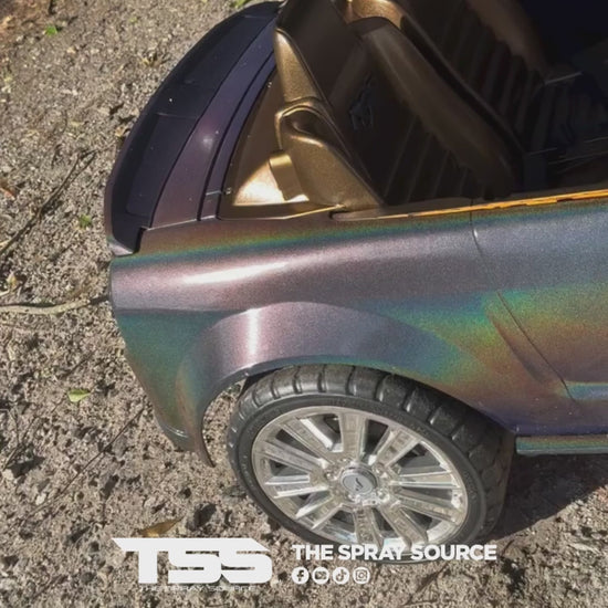 This pearl provides a holographic effect without the texture of micro flake. It mimics the look of "Psychedelic", "oil slick" or "prizmatic" vinyl wrap, with the benefit of being able to be used in tradtional paint, liquid wrap, epoxy, etc. This color is great for full coverage color change applications (over black) or as effect over other colors like gray or silver.