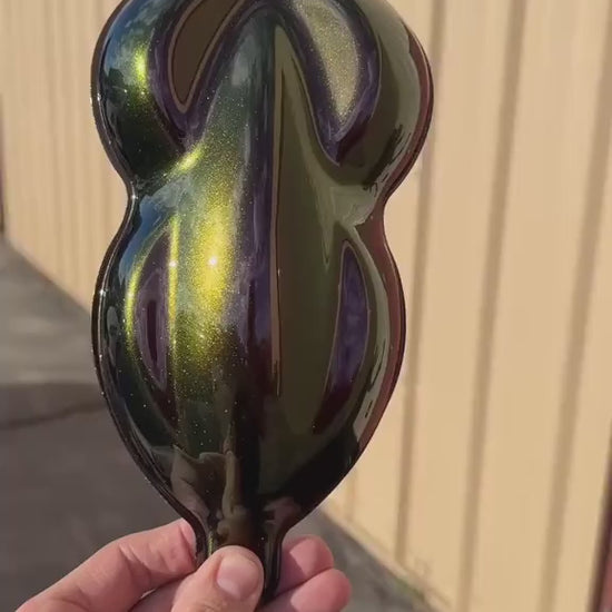 is a strong color changing pearl pigment that has red/green/gold/blue/copper tones. This color is great for full coverage color change applications (over black) or as effect over other colors like red green, or blue. All of our Alpha Custom Color Basecoats are bound in a specifically formulated binder that has pigment control (to avoid striping or mottling), great UV Resistance, crystal clear, and great pearl suspension.